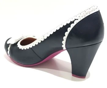 This lovely Cristofoli Shoe is both timeless and elegant. This retro style is in a versatile navy blue leather, and it is adorned with white scalloping and bow on the toe. It’s a fun twist to the classic pump