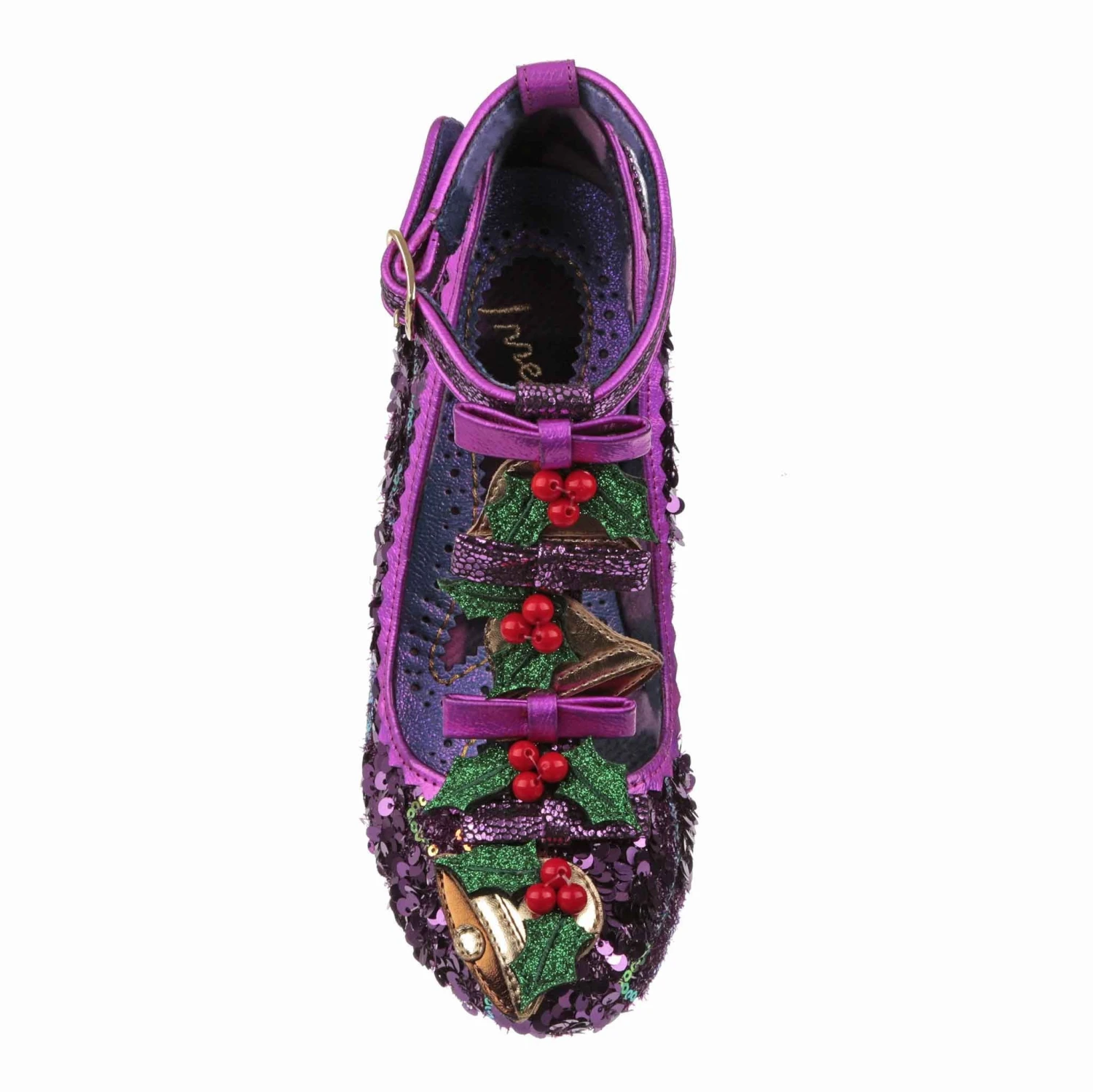 Buckle into these low-heeled lovelies covered with purple and iridescent sequins, a gorgeous glitter cone heel and metallic purple t-bar ankle strap to get the festive feels going! The t-bar is adorned with gold bells, shiny bows and perfect boughs of holly that just make you want to sing ‘fa la la’!