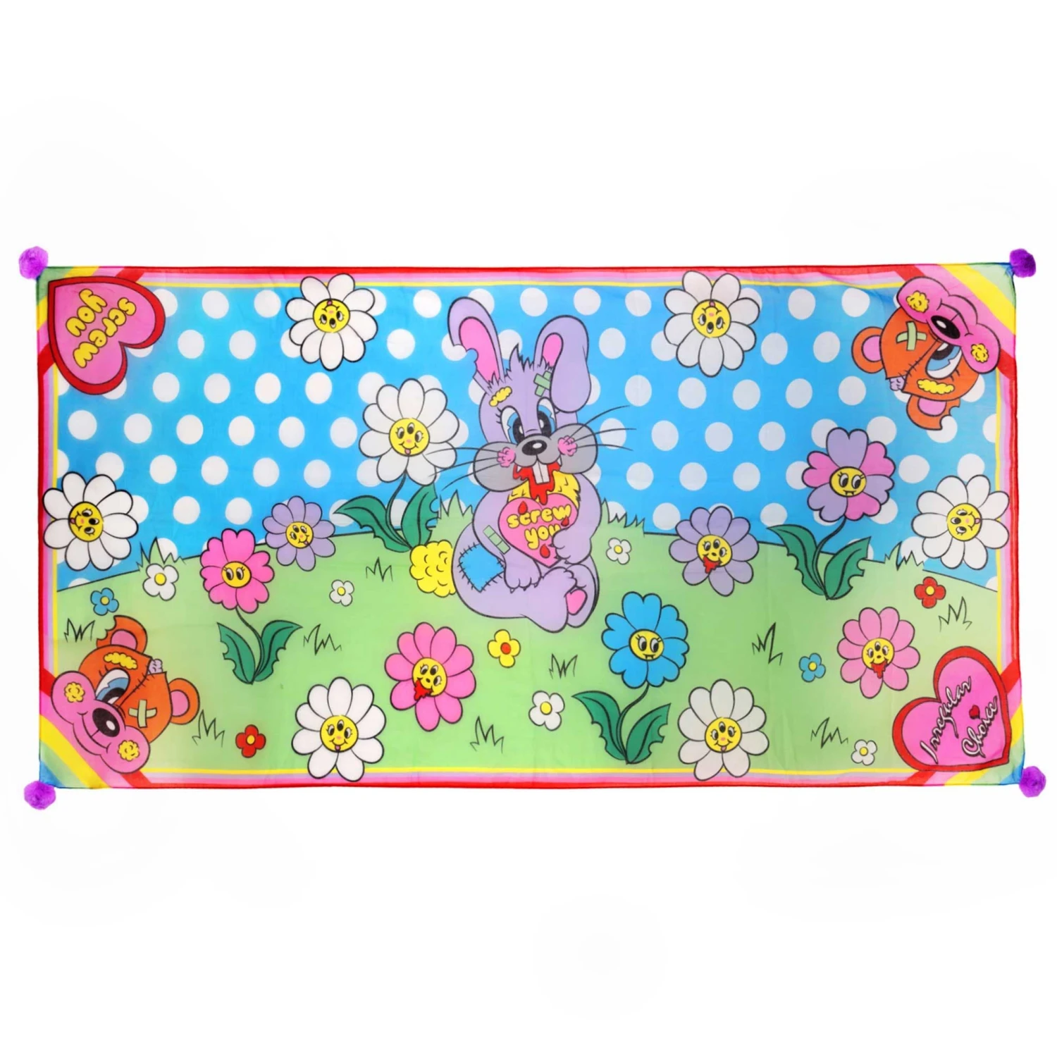 What appears to be an adorable bunny in a field surrounded by flowers is really a creepy scene; covered in blood the bunny stares ominously, with three-eyed evil daisies dotted around the scarf. In the corners of this large scarf are rainbows, hearts and the busted bear face, finished with pink pom poms!