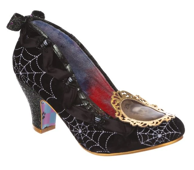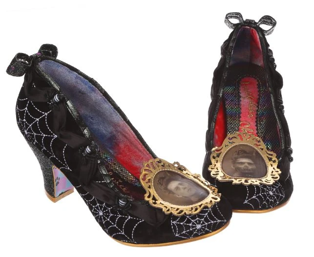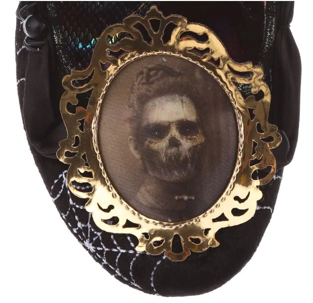 Delight in absolute spooky pleasure at these fabulous heels! Plush black fabric is embroidered with spectral spiderwebs and embellished with luxurious draped satin swags and tiny 3D spiders along the upper edge.  An ornate golden frame features a picture with a surprise – a creepy portrait that decays to reveal a gruesome skull with each movement. Perfect party piece to get people talking or just to wear and have hours of miserable fun looking at – you won’t dare to miss these, or else…