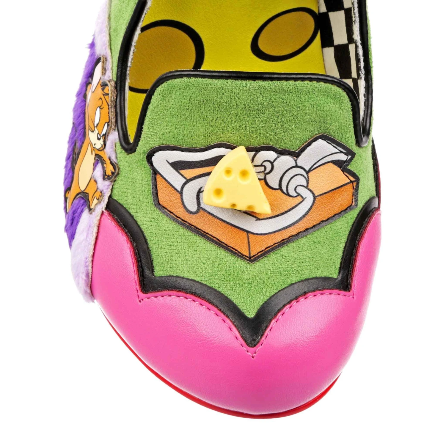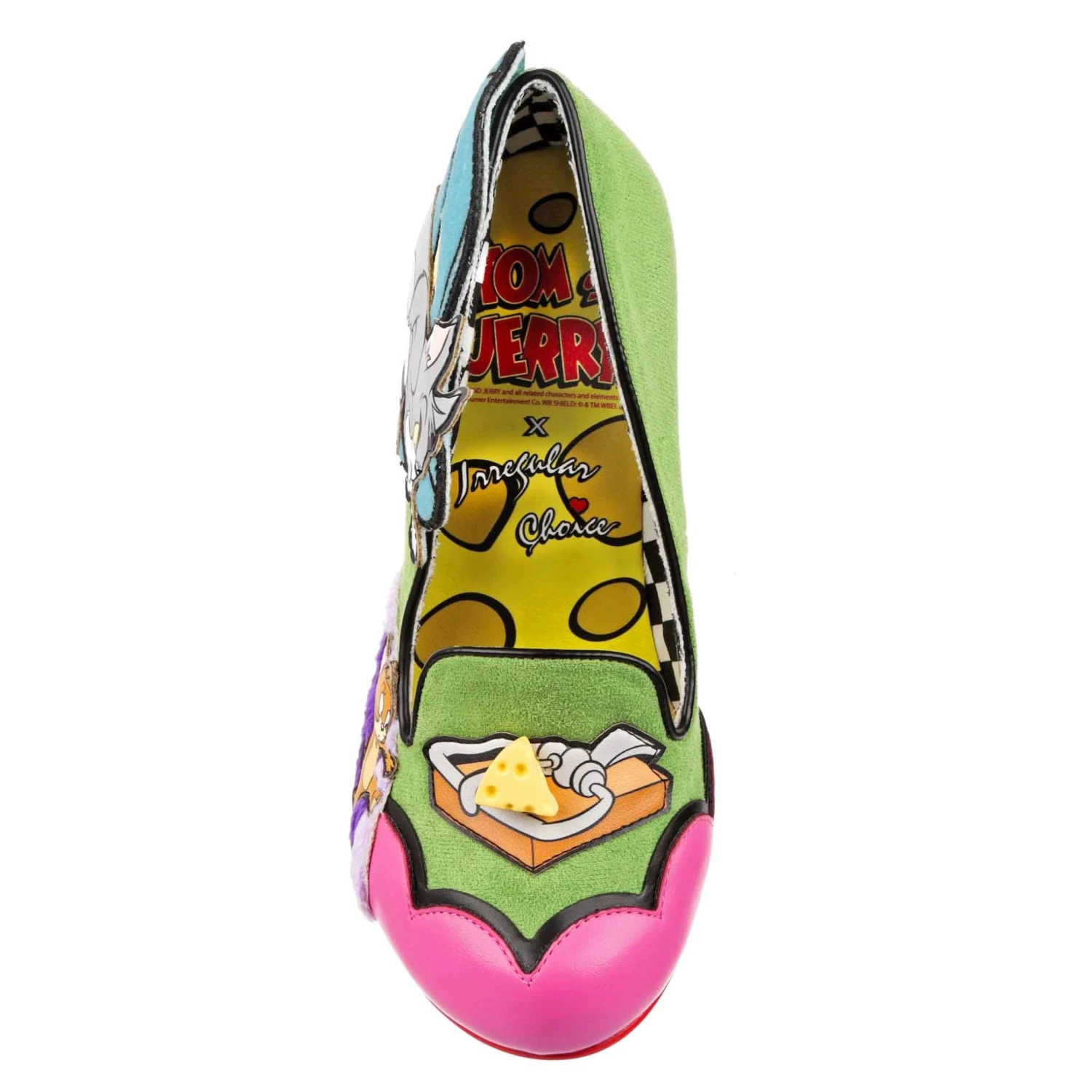 The cutest slip on heels! Get ready to capture all the fun of a Saturday morning watching Tom and Jerry with these adorable court shoes! Gorgeous textured teal velvet is paired with plush deep purple mimicking a rug by the toe, with both Tom and Jerry on each shoe. One toe has a trap set up with a 3D cheese charm that Jerry is sneaking towards, and on the other the cheese has been grabbed! Cute, colourful and cheeky – the perfect addition to any Saturday morning cartoon lover’s wardrobe!