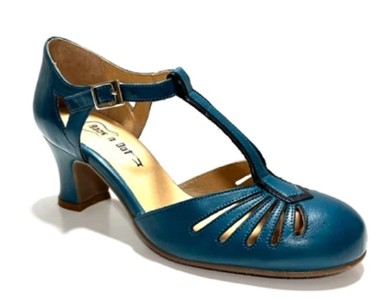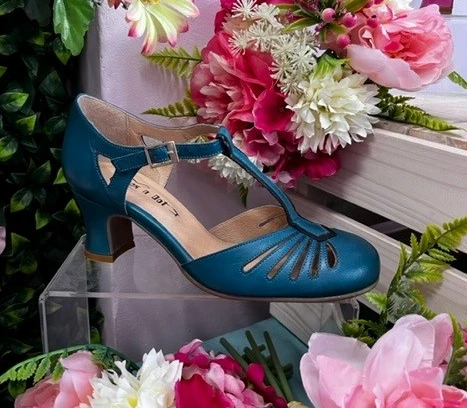 These Beautiful vintage inspired mid heels are in the softest leather that is just heaven on your feet! This pair is in a beautiful petrol blue leather with a versatile black piping.
