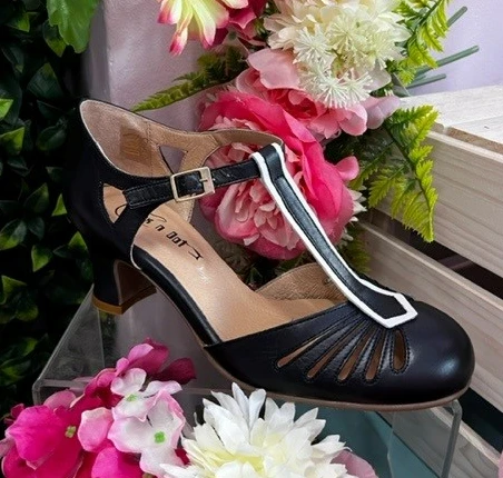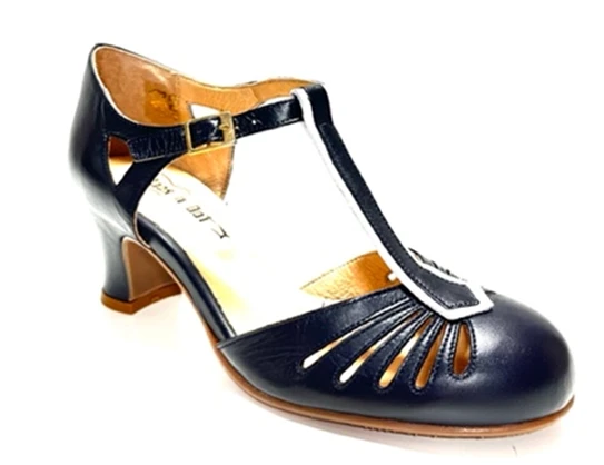 These Beautiful vintage inspired mid heels are in the softest leather that is just heaven on your feet! This pair is in a dark blue leather with a contrasting white piping.